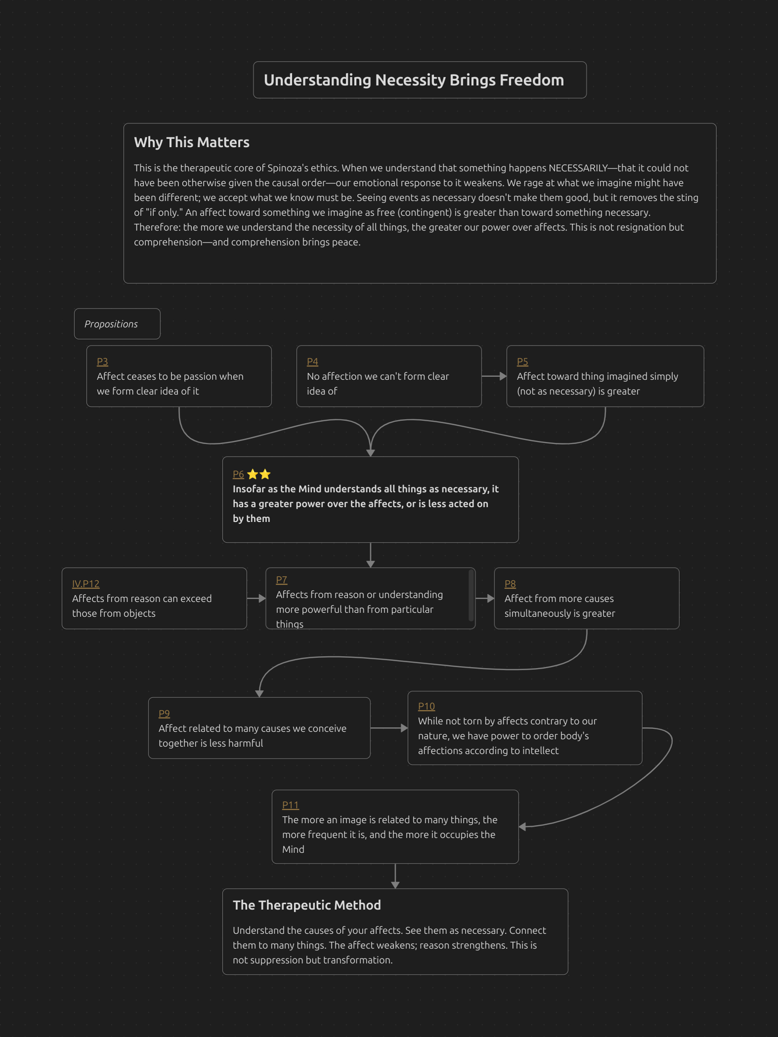 This is the therapeutic core of Spinoza’s ethics. When we understand that something happens NECESSARILY—that it could not have been otherwise given the causal order—our emotional response to it weakens. We rage at what we imagine might have been different; we accept what we know must be. Seeing events as necessary doesn’t make them good, but it removes the sting of “if only.” An affect toward something we imagine as free (contingent) is greater than toward something necessary. Therefore: the more we understand the necessity of all things, the greater our power over affects. This is not resignation but comprehension—and comprehension brings peace.