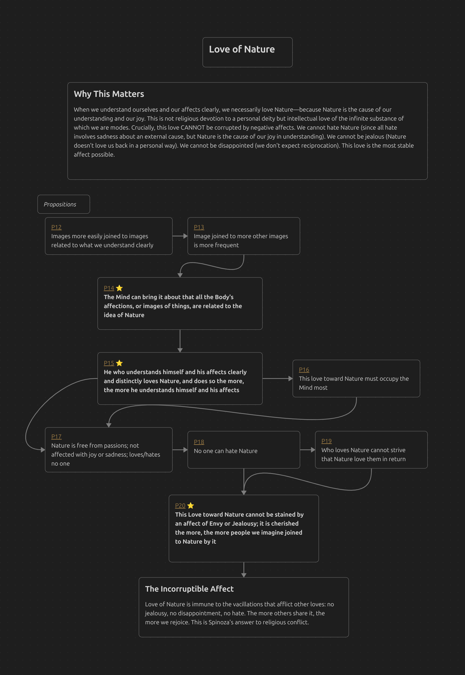 When we understand ourselves and our affects clearly, we necessarily love Nature—because Nature is the cause of our understanding and our joy. This is not religious devotion to a personal deity but intellectual love of the infinite substance of which we are modes. Crucially, this love CANNOT be corrupted by negative affects. We cannot hate Nature (since all hate involves sadness about an external cause, but Nature is the cause of our joy in understanding). We cannot be jealous (Nature doesn’t love us back in a personal way). We cannot be disappointed (we don’t expect reciprocation). This love is the most stable affect possible.