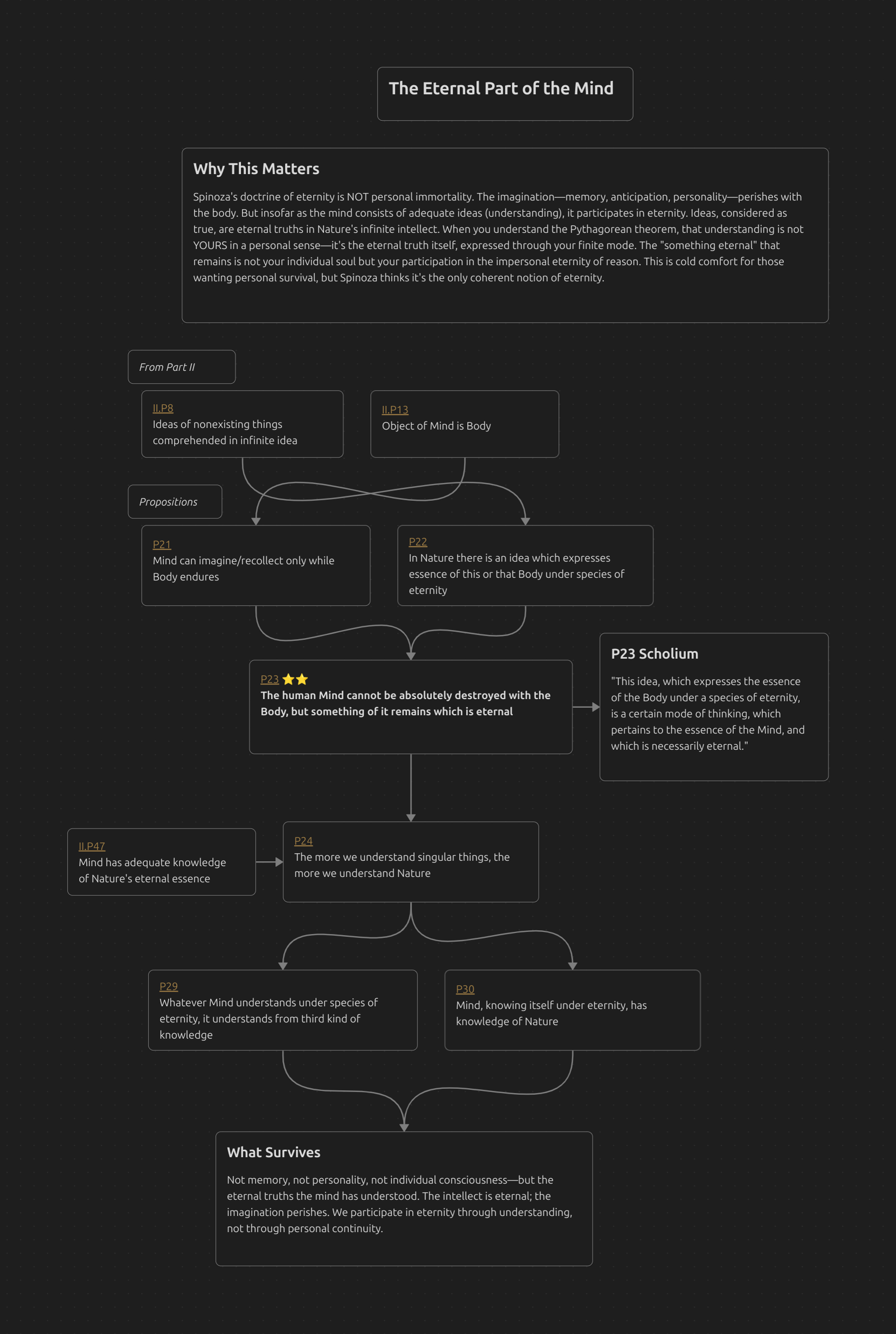Spinoza’s doctrine of eternity is NOT personal immortality. The imagination—memory, anticipation, personality—perishes with the body. But insofar as the mind consists of adequate ideas (understanding), it participates in eternity. Ideas, considered as true, are eternal truths in Nature’s infinite intellect. When you understand the Pythagorean theorem, that understanding is not YOURS in a personal sense—it’s the eternal truth itself, expressed through your finite mode. The “something eternal” that remains is not your individual soul but your participation in the impersonal eternity of reason. This is cold comfort for those wanting personal survival, but Spinoza thinks it’s the only coherent notion of eternity.