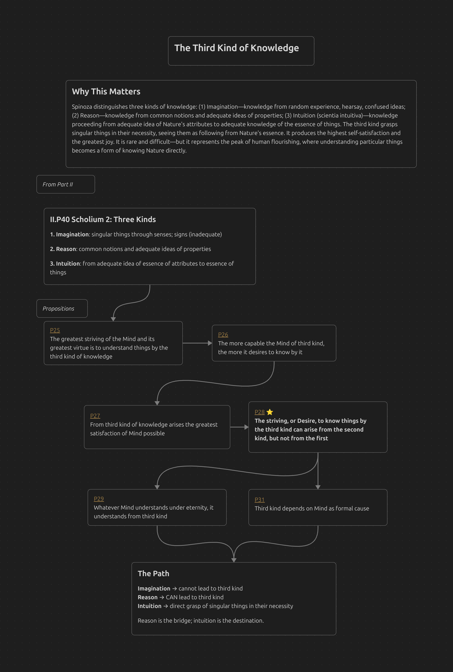 Spinoza distinguishes three kinds of knowledge: (1) Imagination—knowledge from random experience, hearsay, confused ideas; (2) Reason—knowledge from common notions and adequate ideas of properties; (3) Intuition (scientia intuitiva)—knowledge proceeding from adequate idea of Nature’s attributes to adequate knowledge of the essence of things. The third kind grasps singular things in their necessity, seeing them as following from Nature’s essence. It produces the highest self-satisfaction and the greatest joy. It is rare and difficult—but it represents the peak of human flourishing, where understanding particular things becomes a form of knowing Nature directly.