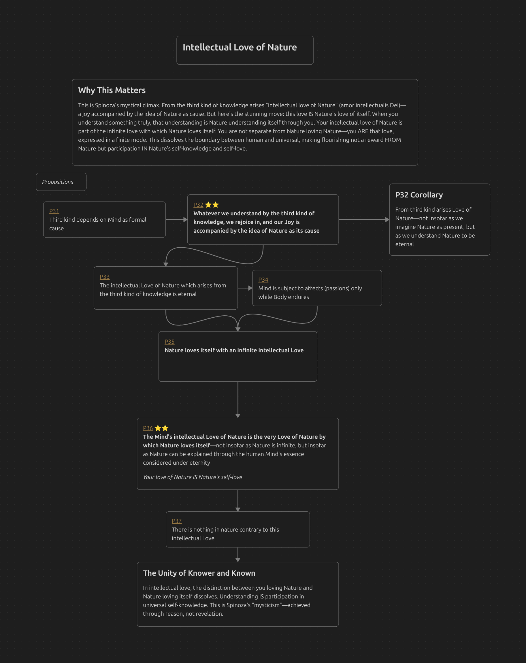 This is Spinoza’s mystical climax. From the third kind of knowledge arises “intellectual love of Nature” (amor intellectualis Dei)—a joy accompanied by the idea of Nature as cause. But here’s the stunning move: this love IS Nature’s love of itself. When you understand something truly, that understanding is Nature understanding itself through you. Your intellectual love of Nature is part of the infinite love with which Nature loves itself. You are not separate from Nature loving Nature—you ARE that love, expressed in a finite mode. This dissolves the boundary between human and universal, making flourishing not a reward FROM Nature but participation IN Nature’s self-knowledge and self-love.