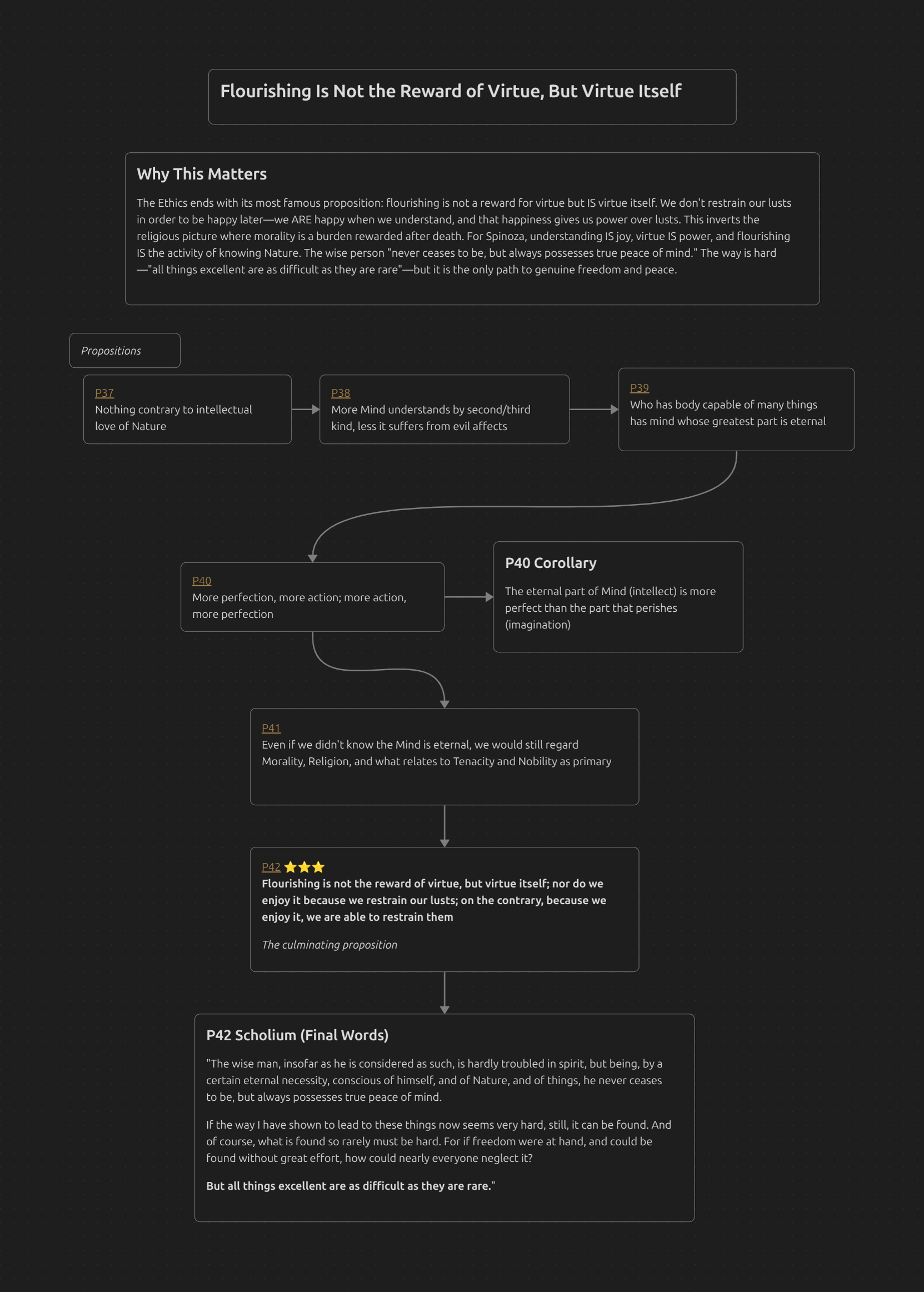 The Ethics ends with its most famous proposition: flourishing is not a reward for virtue but IS virtue itself. We don’t restrain our lusts in order to be happy later—we ARE happy when we understand, and that happiness gives us power over lusts. This inverts the religious picture where morality is a burden rewarded after death. For Spinoza, understanding IS joy, virtue IS power, and flourishing IS the activity of knowing Nature. The wise person “never ceases to be, but always possesses true peace of mind.” The way is hard—“all things excellent are as difficult as they are rare”—but it is the only path to genuine freedom and peace.