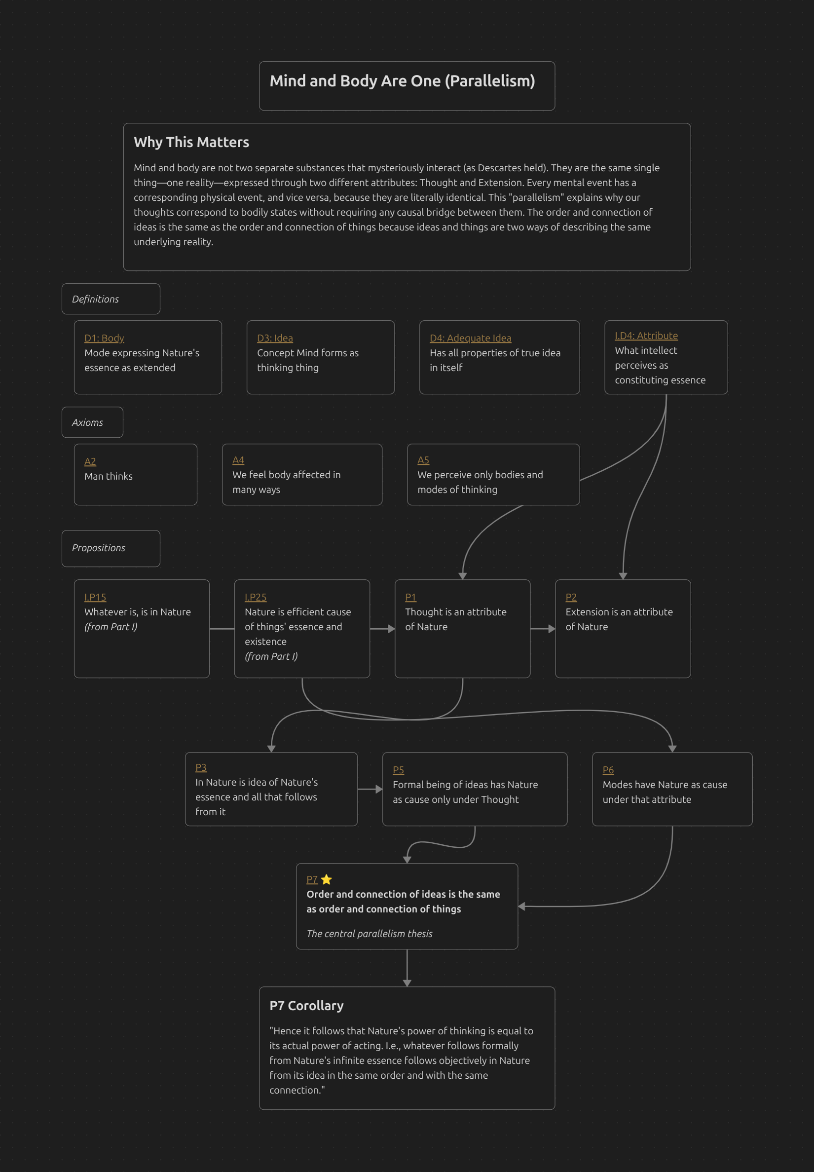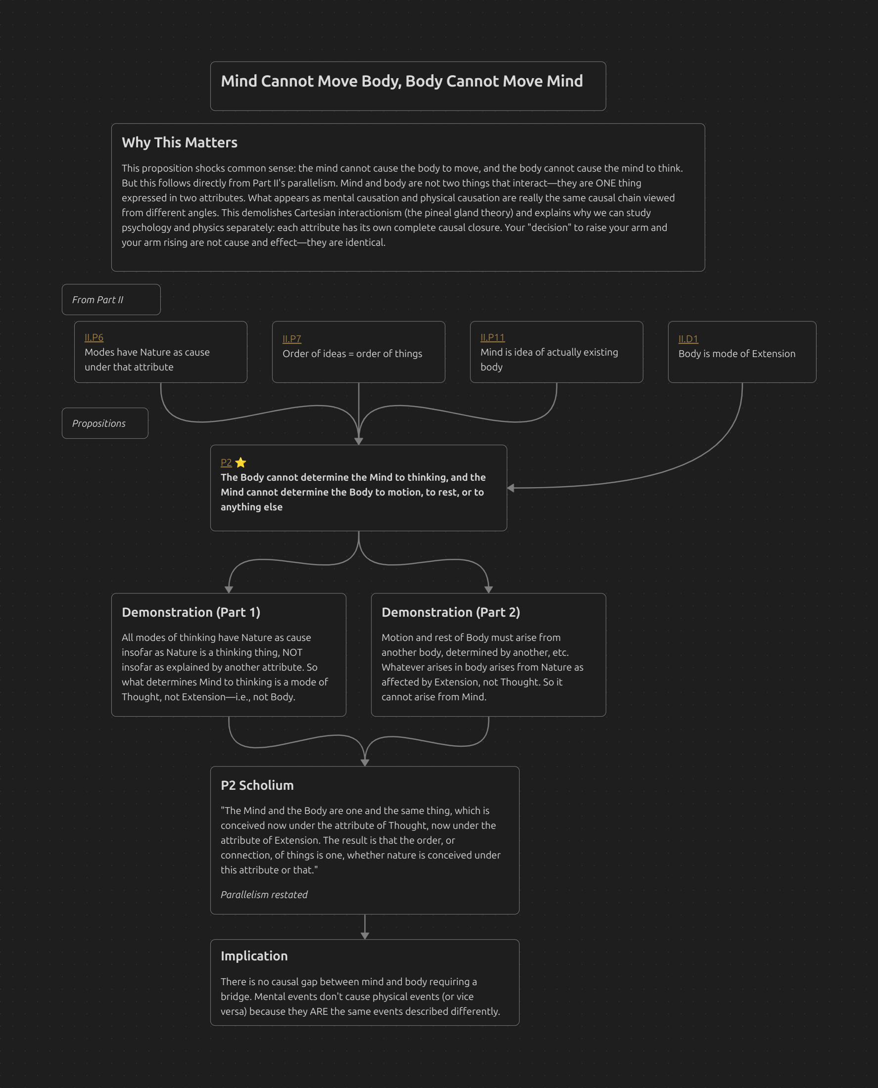 This proposition shocks common sense: the mind cannot cause the body to move, and the body cannot cause the mind to think. But this follows directly from Part II’s parallelism. Mind and body are not two things that interact—they are ONE thing expressed in two attributes. What appears as mental causation and physical causation are really the same causal chain viewed from different angles. This demolishes Cartesian interactionism (the pineal gland theory) and explains why we can study psychology and physics separately: each attribute has its own complete causal closure. Your “decision” to raise your arm and your arm rising are not cause and effect—they are identical.