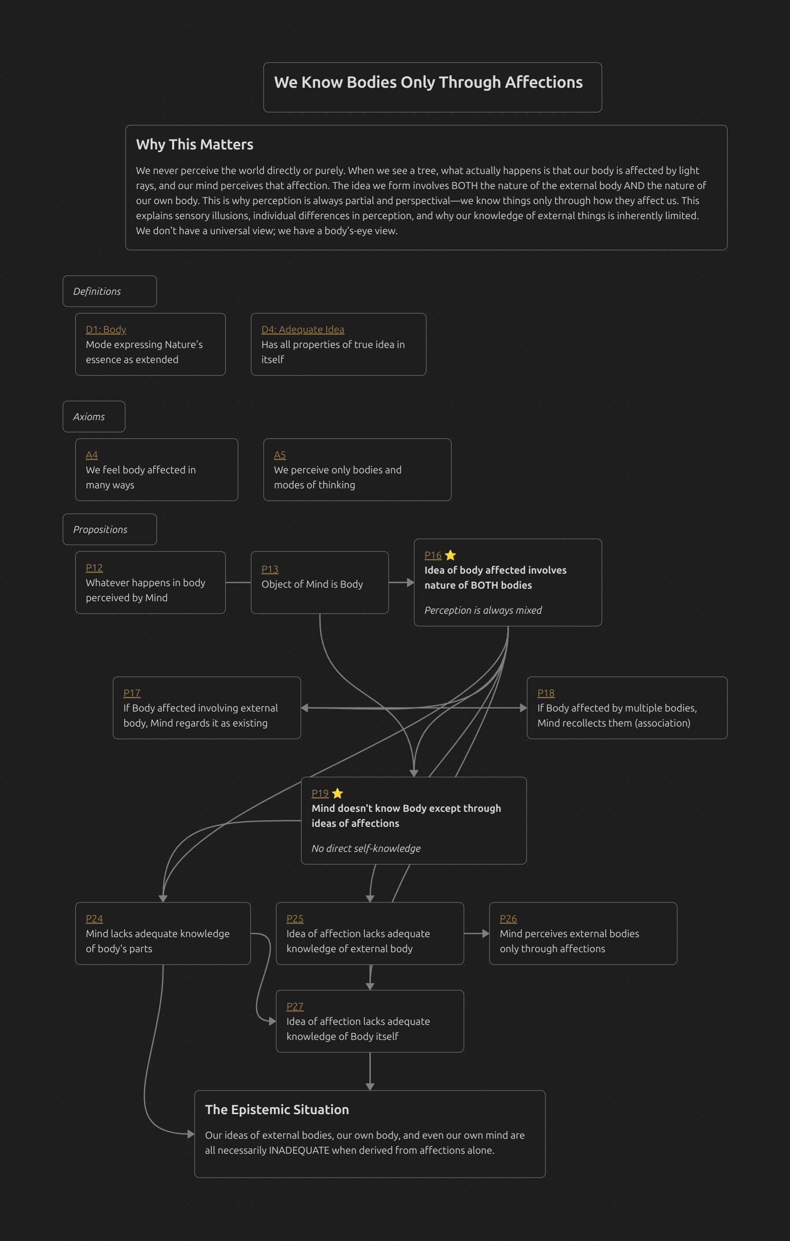 We never perceive the world directly or purely. When we see a tree, what actually happens is that our body is affected by light rays, and our mind perceives that affection. The idea we form involves BOTH the nature of the external body AND the nature of our own body. This is why perception is always partial and perspectival—we know things only through how they affect us. This explains sensory illusions, individual differences in perception, and why our knowledge of external things is inherently limited. We don’t have a universal view; we have a body’s-eye view.