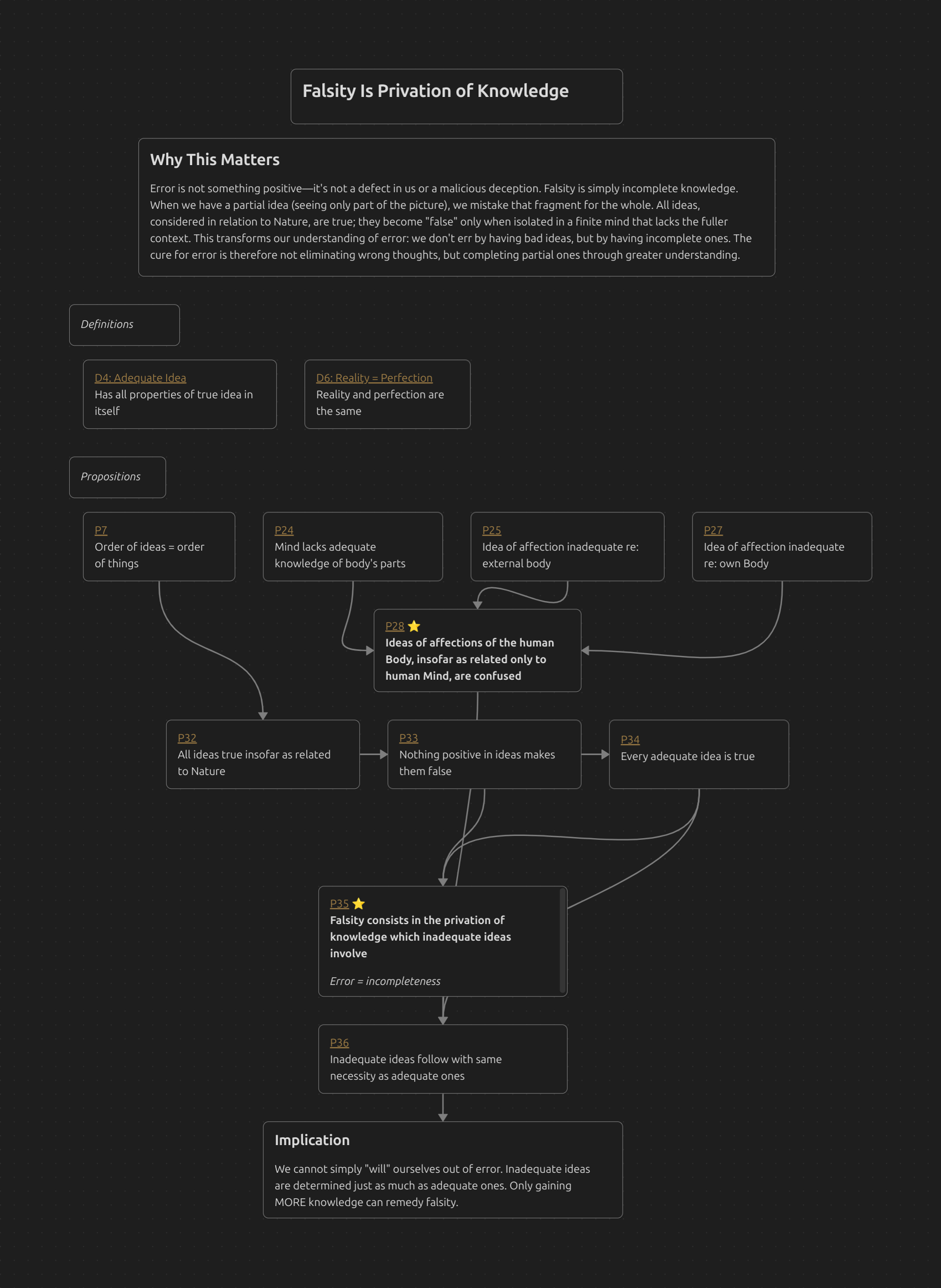 Error is not something positive—it’s not a defect in us or a malicious deception. Falsity is simply incomplete knowledge. When we have a partial idea (seeing only part of the picture), we mistake that fragment for the whole. All ideas, considered in relation to Nature, are true; they become “false” only when isolated in a finite mind that lacks the fuller context. This transforms our understanding of error: we don’t err by having bad ideas, but by having incomplete ones. The cure for error is therefore not eliminating wrong thoughts, but completing partial ones through greater understanding.