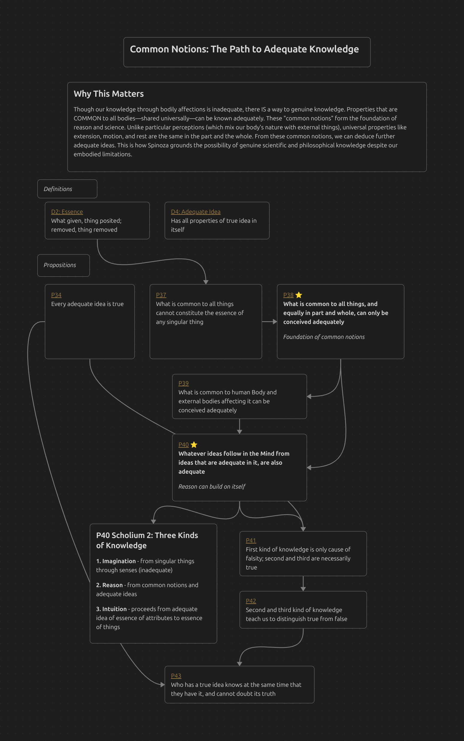 Though our knowledge through bodily affections is inadequate, there IS a way to genuine knowledge. Properties that are COMMON to all bodies—shared universally—can be known adequately. These “common notions” form the foundation of reason and science. Unlike particular perceptions (which mix our body’s nature with external things), universal properties like extension, motion, and rest are the same in the part and the whole. From these common notions, we can deduce further adequate ideas. This is how Spinoza grounds the possibility of genuine scientific and philosophical knowledge despite our embodied limitations.