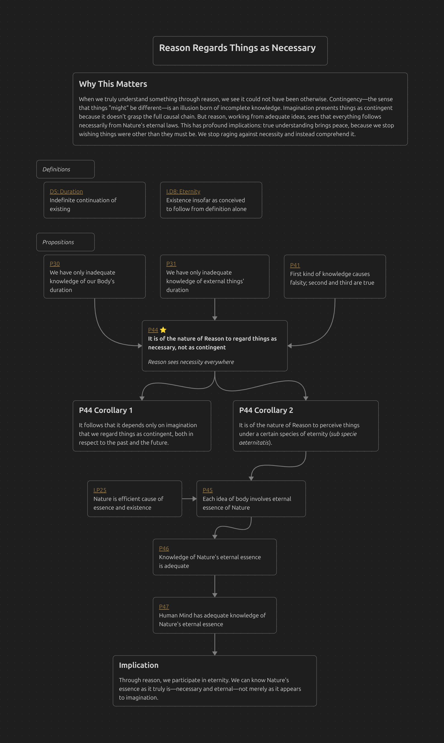 When we truly understand something through reason, we see it could not have been otherwise. Contingency—the sense that things “might” be different—is an illusion born of incomplete knowledge. Imagination presents things as contingent because it doesn’t grasp the full causal chain. But reason, working from adequate ideas, sees that everything follows necessarily from Nature’s eternal laws. This has profound implications: true understanding brings peace, because we stop wishing things were other than they must be. We stop raging against necessity and instead comprehend it.