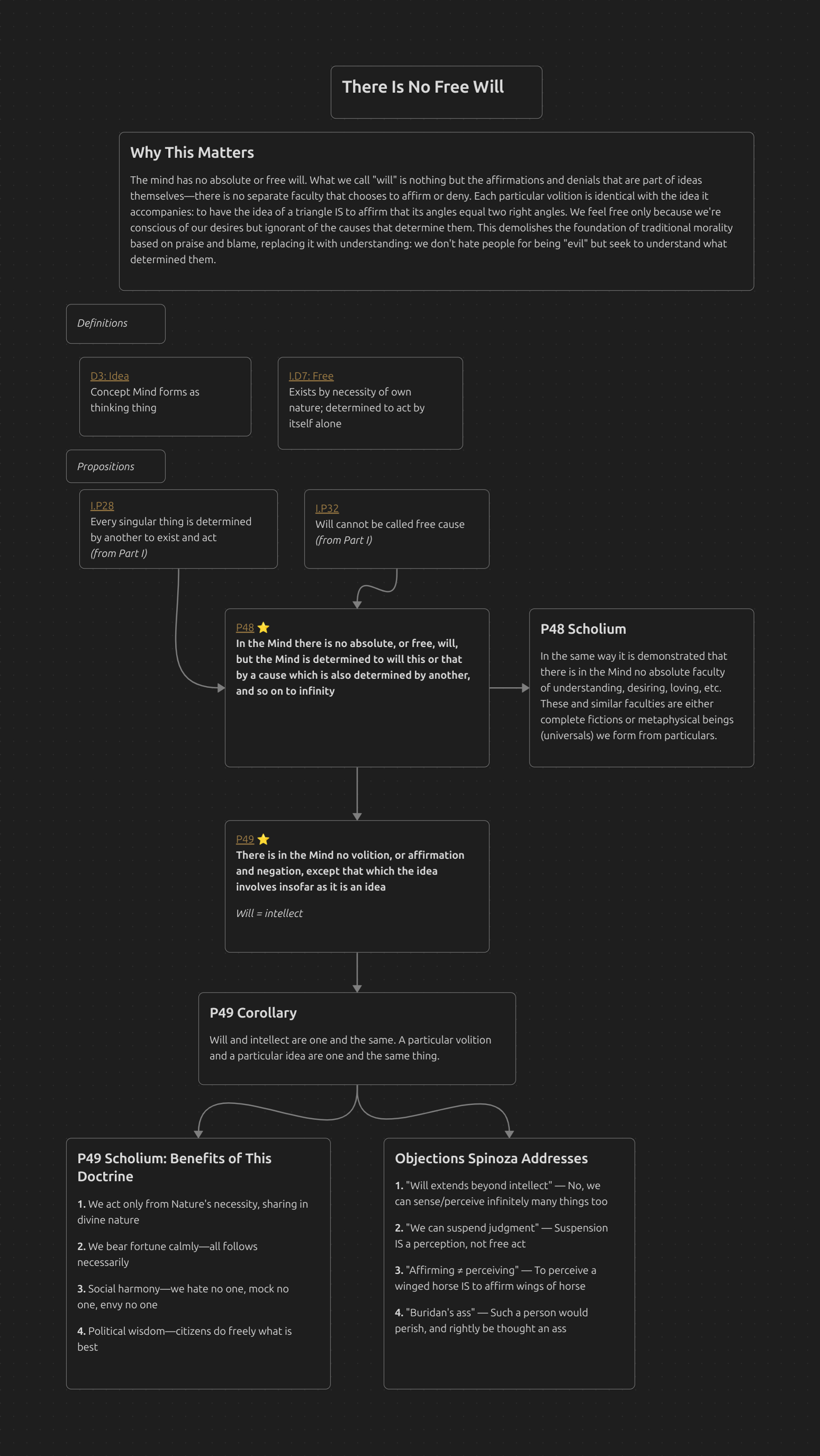 The mind has no absolute or free will. What we call “will” is nothing but the affirmations and denials that are part of ideas themselves—there is no separate faculty that chooses to affirm or deny. Each particular volition is identical with the idea it accompanies: to have the idea of a triangle IS to affirm that its angles equal two right angles. We feel free only because we’re conscious of our desires but ignorant of the causes that determine them. This demolishes the foundation of traditional morality based on praise and blame, replacing it with understanding: we don’t hate people for being “evil” but seek to understand what determined them.
