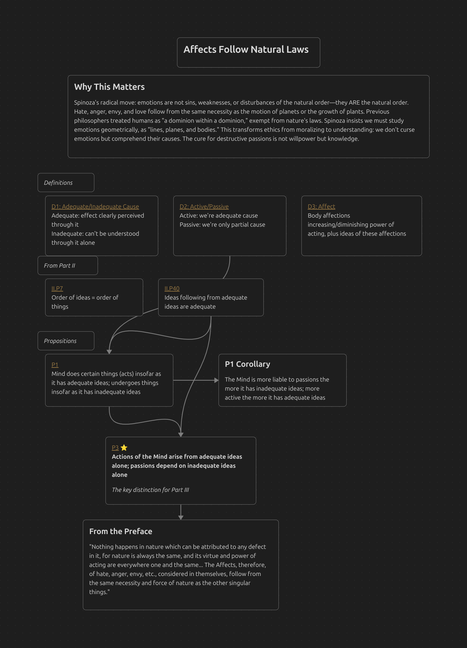 Spinoza’s radical move: emotions are not sins, weaknesses, or disturbances of the natural order—they ARE the natural order. Hate, anger, envy, and love follow from the same necessity as the motion of planets or the growth of plants. Previous philosophers treated humans as “a dominion within a dominion,” exempt from nature’s laws. Spinoza insists we must study emotions geometrically, as “lines, planes, and bodies.” This transforms ethics from moralizing to understanding: we don’t curse emotions but comprehend their causes. The cure for destructive passions is not willpower but knowledge.
