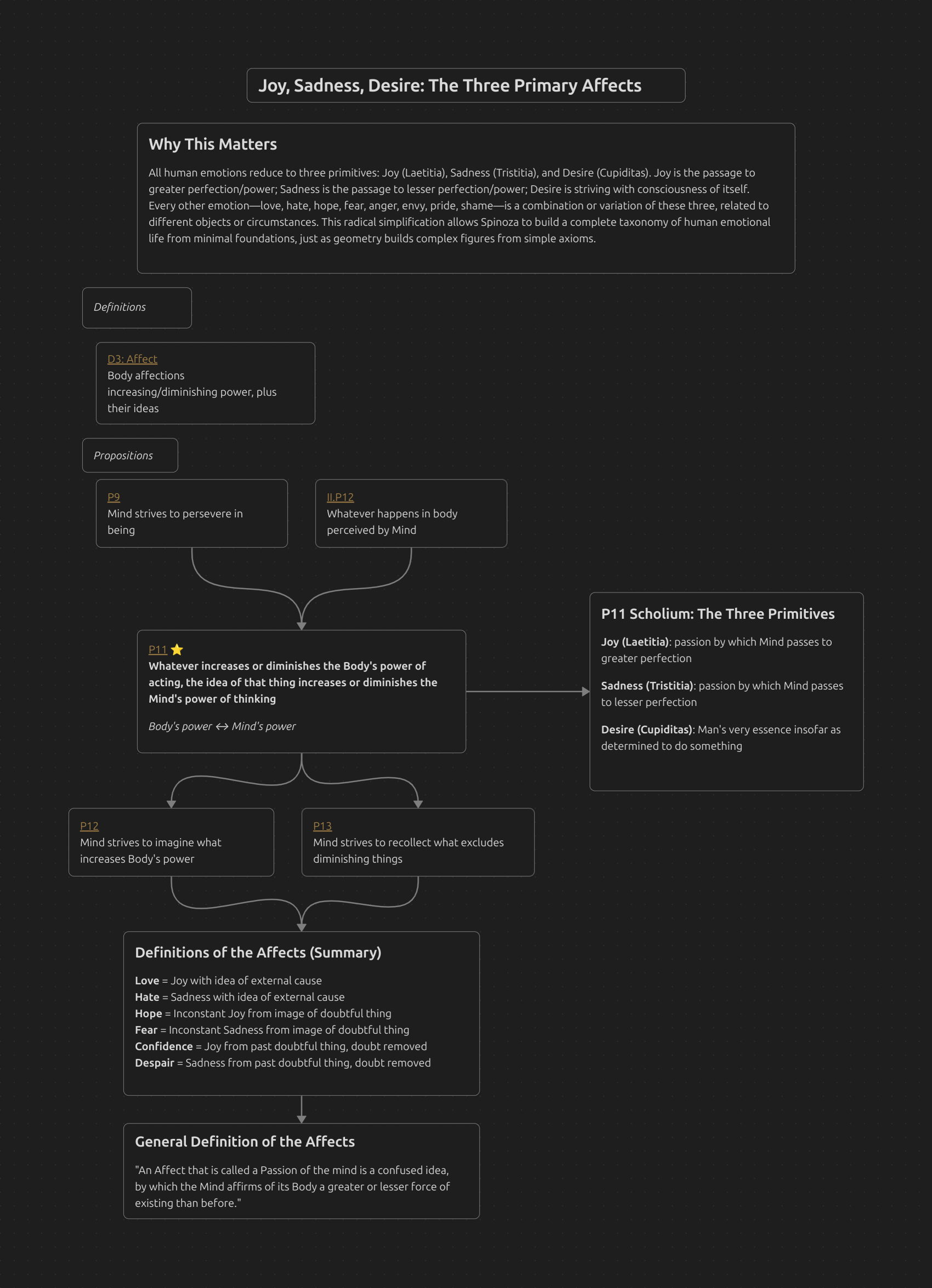 All human emotions reduce to three primitives: Joy (Laetitia), Sadness (Tristitia), and Desire (Cupiditas). Joy is the passage to greater perfection/power; Sadness is the passage to lesser perfection/power; Desire is striving with consciousness of itself. Every other emotion—love, hate, hope, fear, anger, envy, pride, shame—is a combination or variation of these three, related to different objects or circumstances. This radical simplification allows Spinoza to build a complete taxonomy of human emotional life from minimal foundations, just as geometry builds complex figures from simple axioms.