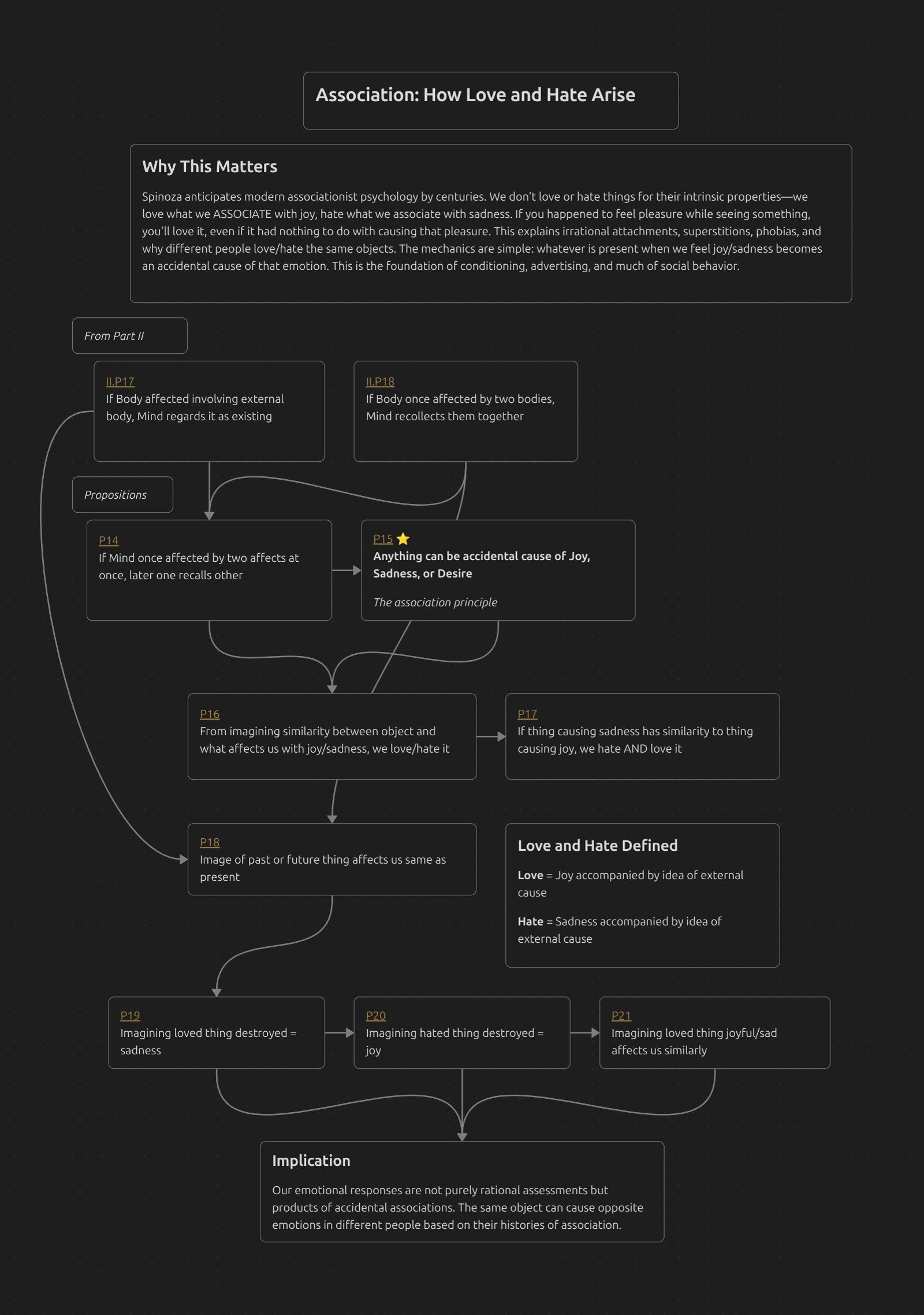 Spinoza anticipates modern associationist psychology by centuries. We don’t love or hate things for their intrinsic properties—we love what we ASSOCIATE with joy, hate what we associate with sadness. If you happened to feel pleasure while seeing something, you’ll love it, even if it had nothing to do with causing that pleasure. This explains irrational attachments, superstitions, phobias, and why different people love/hate the same objects. The mechanics are simple: whatever is present when we feel joy/sadness becomes an accidental cause of that emotion. This is the foundation of conditioning, advertising, and much of social behavior.
