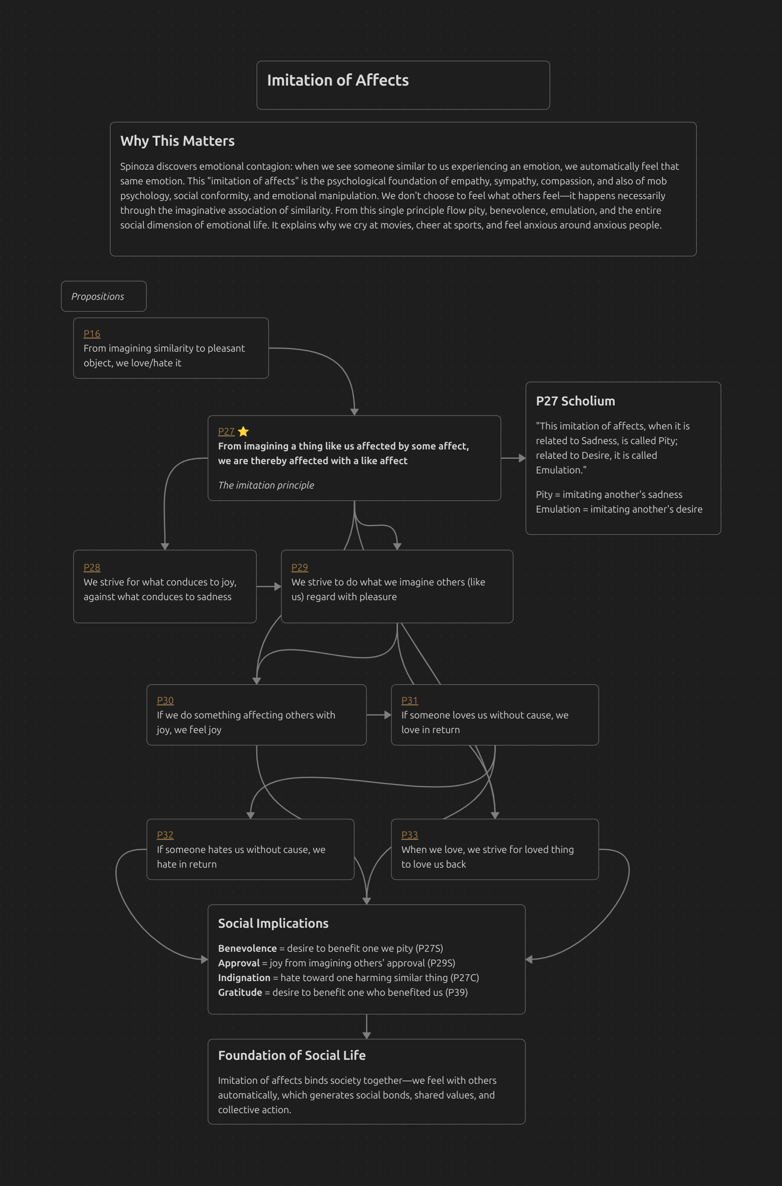 Spinoza discovers emotional contagion: when we see someone similar to us experiencing an emotion, we automatically feel that same emotion. This “imitation of affects” is the psychological foundation of empathy, sympathy, compassion, and also of mob psychology, social conformity, and emotional manipulation. We don’t choose to feel what others feel—it happens necessarily through the imaginative association of similarity. From this single principle flow pity, benevolence, emulation, and the entire social dimension of emotional life. It explains why we cry at movies, cheer at sports, and feel anxious around anxious people.
