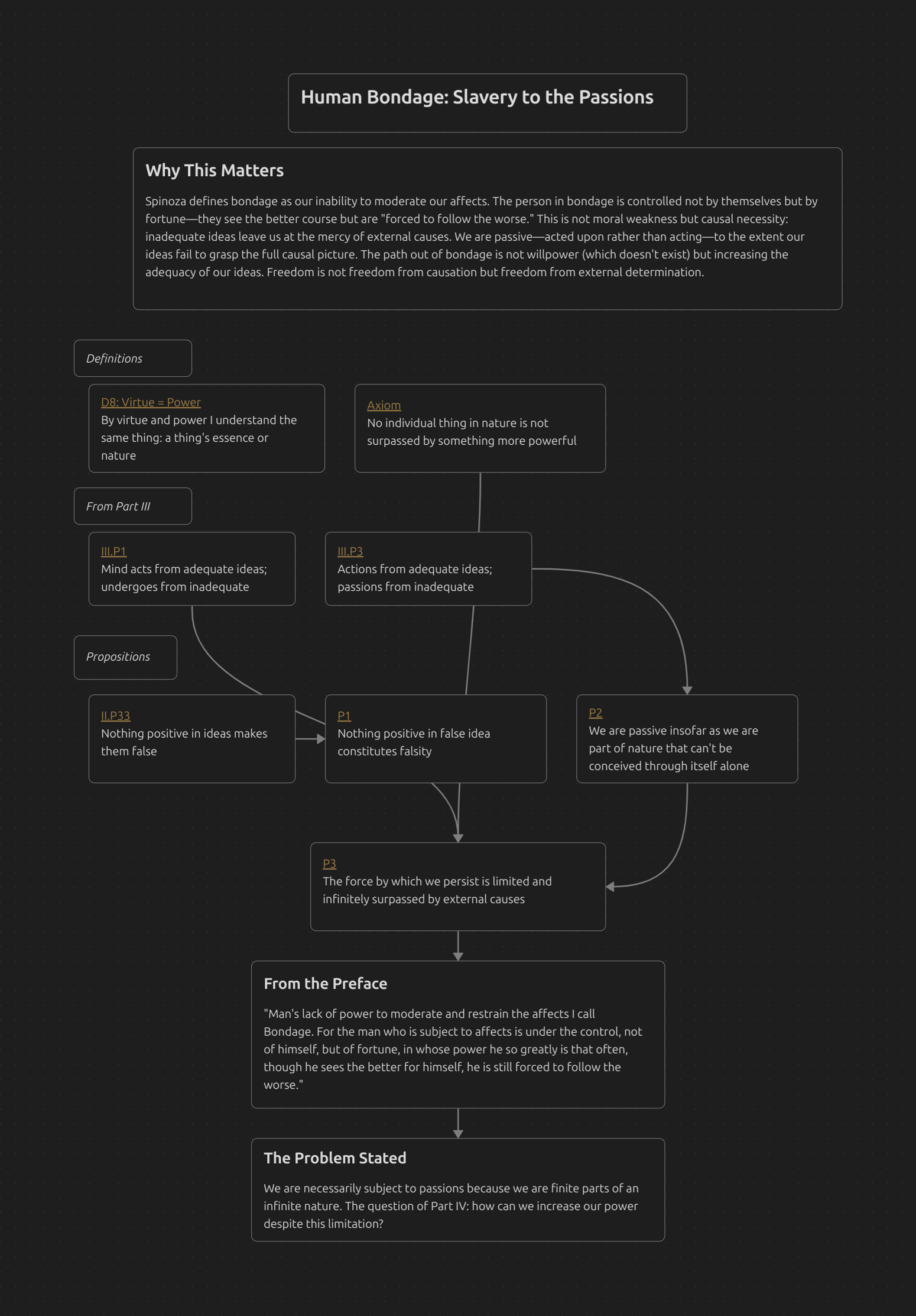 Spinoza defines bondage as our inability to moderate our affects. The person in bondage is controlled not by themselves but by fortune—they see the better course but are “forced to follow the worse.” This is not moral weakness but causal necessity: inadequate ideas leave us at the mercy of external causes. We are passive—acted upon rather than acting—to the extent our ideas fail to grasp the full causal picture. The path out of bondage is not willpower (which doesn’t exist) but increasing the adequacy of our ideas. Freedom is not freedom from causation but freedom from external determination.
