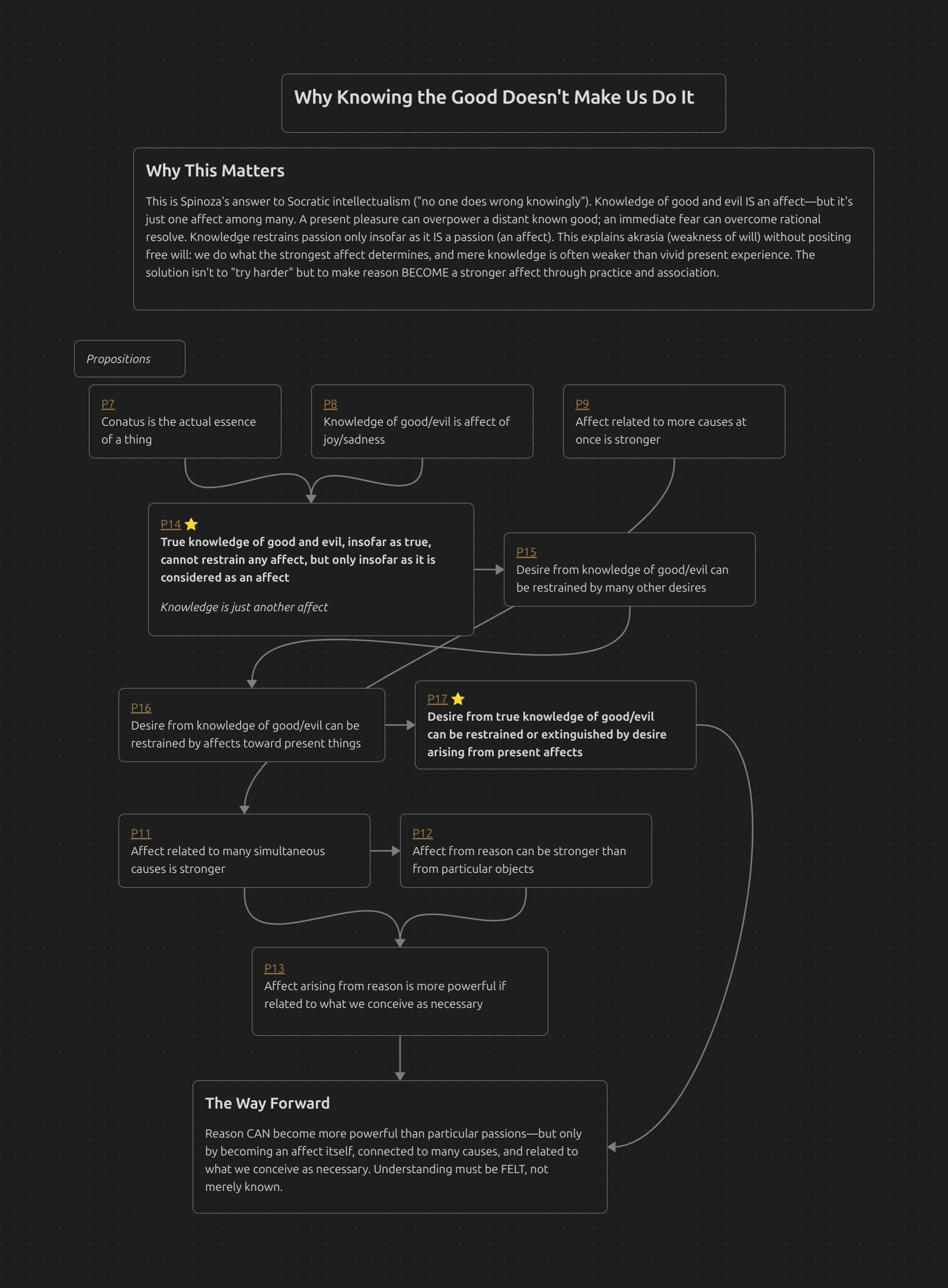 This is Spinoza’s answer to Socratic intellectualism (“no one does wrong knowingly”). Knowledge of good and evil IS an affect—but it’s just one affect among many. A present pleasure can overpower a distant known good; an immediate fear can overcome rational resolve. Knowledge restrains passion only insofar as it IS a passion (an affect). This explains akrasia (weakness of will) without positing free will: we do what the strongest affect determines, and mere knowledge is often weaker than vivid present experience. The solution isn’t to “try harder” but to make reason BECOME a stronger affect through practice and association.