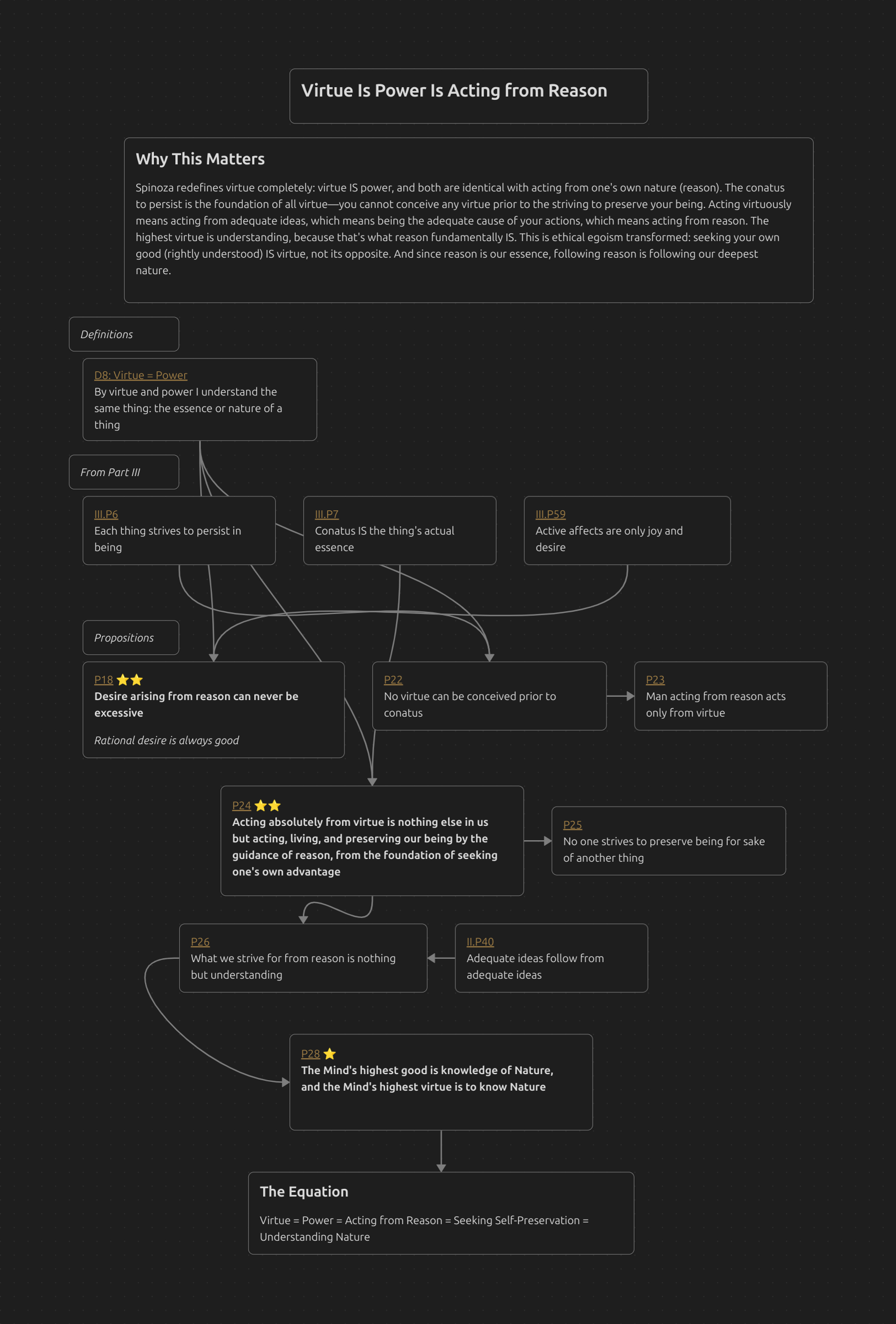 Spinoza redefines virtue completely: virtue IS power, and both are identical with acting from one’s own nature (reason). The conatus to persist is the foundation of all virtue—you cannot conceive any virtue prior to the striving to preserve your being. Acting virtuously means acting from adequate ideas, which means being the adequate cause of your actions, which means acting from reason. The highest virtue is understanding, because that’s what reason fundamentally IS. This is ethical egoism transformed: seeking your own good (rightly understood) IS virtue, not its opposite. And since reason is our essence, following reason is following our deepest nature.