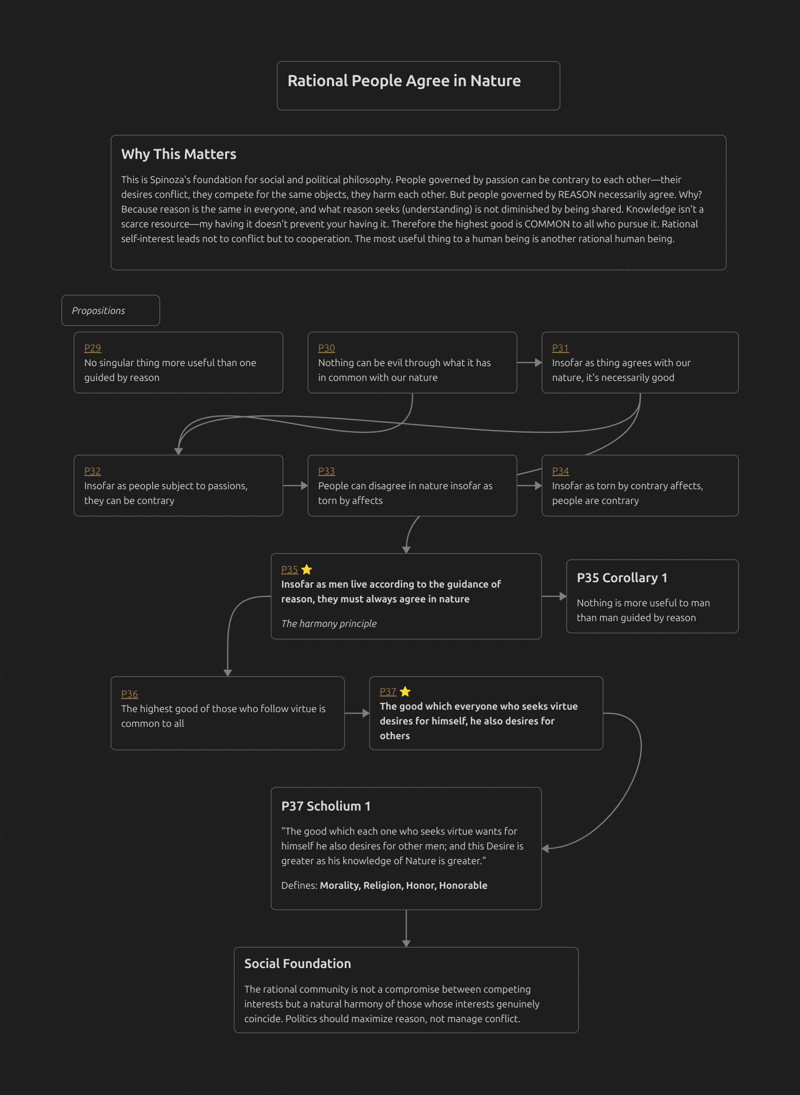 This is Spinoza’s foundation for social and political philosophy. People governed by passion can be contrary to each other—their desires conflict, they compete for the same objects, they harm each other. But people governed by REASON necessarily agree. Why? Because reason is the same in everyone, and what reason seeks (understanding) is not diminished by being shared. Knowledge isn’t a scarce resource—my having it doesn’t prevent your having it. Therefore the highest good is COMMON to all who pursue it. Rational self-interest leads not to conflict but to cooperation. The most useful thing to a human being is another rational human being.