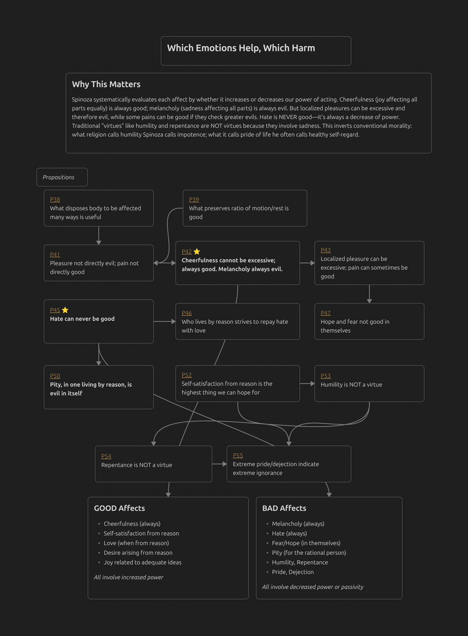 Spinoza systematically evaluates each affect by whether it increases or decreases our power of acting. Cheerfulness (joy affecting all parts equally) is always good; melancholy (sadness affecting all parts) is always evil. But localized pleasures can be excessive and therefore evil, while some pains can be good if they check greater evils. Hate is NEVER good—it’s always a decrease of power. Traditional “virtues” like humility and repentance are NOT virtues because they involve sadness. This inverts conventional morality: what religion calls humility Spinoza calls impotence; what it calls pride of life he often calls healthy self-regard.