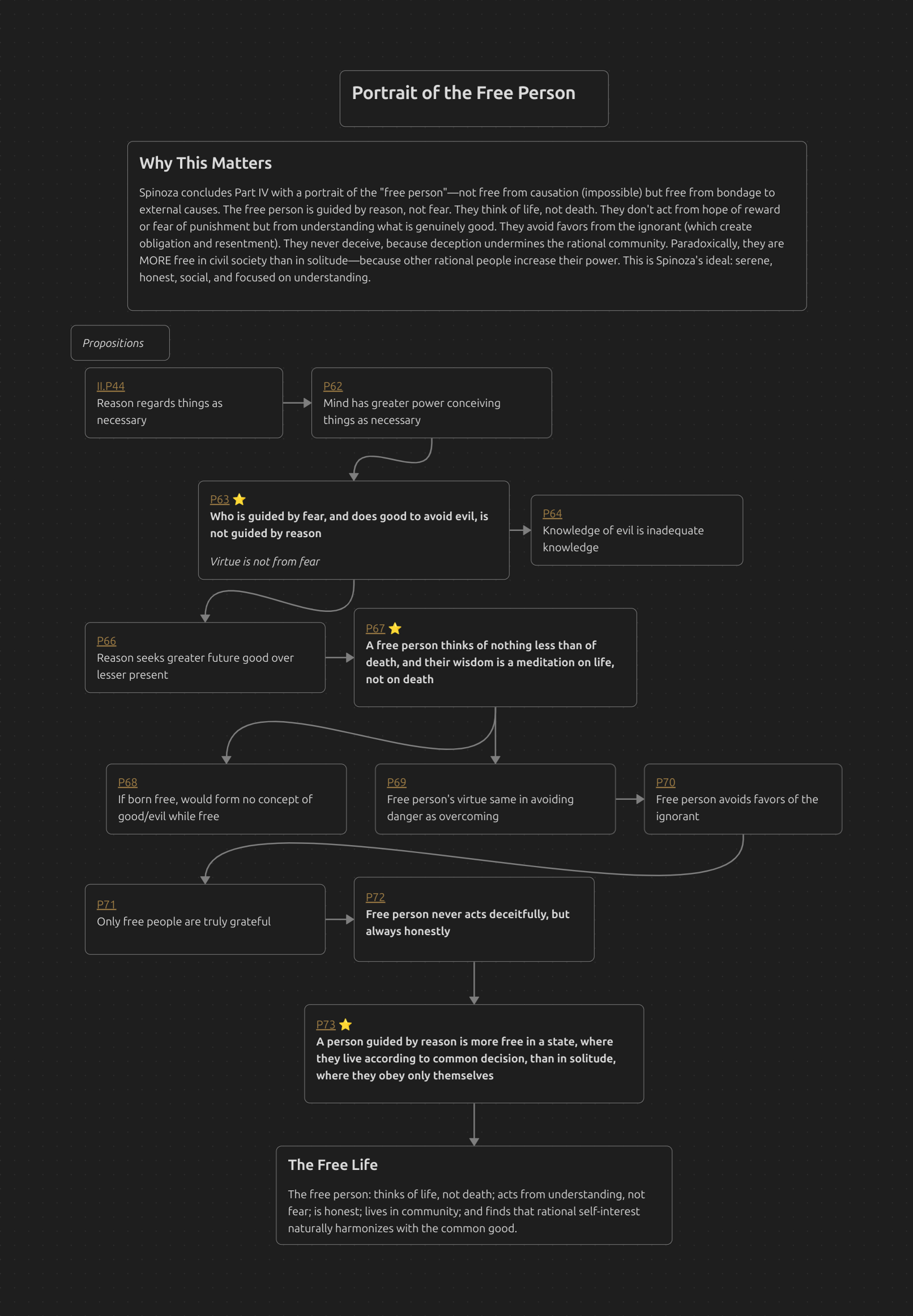 Spinoza concludes Part IV with a portrait of the “free person”—not free from causation (impossible) but free from bondage to external causes. The free person is guided by reason, not fear. They think of life, not death. They don’t act from hope of reward or fear of punishment but from understanding what is genuinely good. They avoid favors from the ignorant (which create obligation and resentment). They never deceive, because deception undermines the rational community. Paradoxically, they are MORE free in civil society than in solitude—because other rational people increase their power. This is Spinoza’s ideal: serene, honest, social, and focused on understanding.