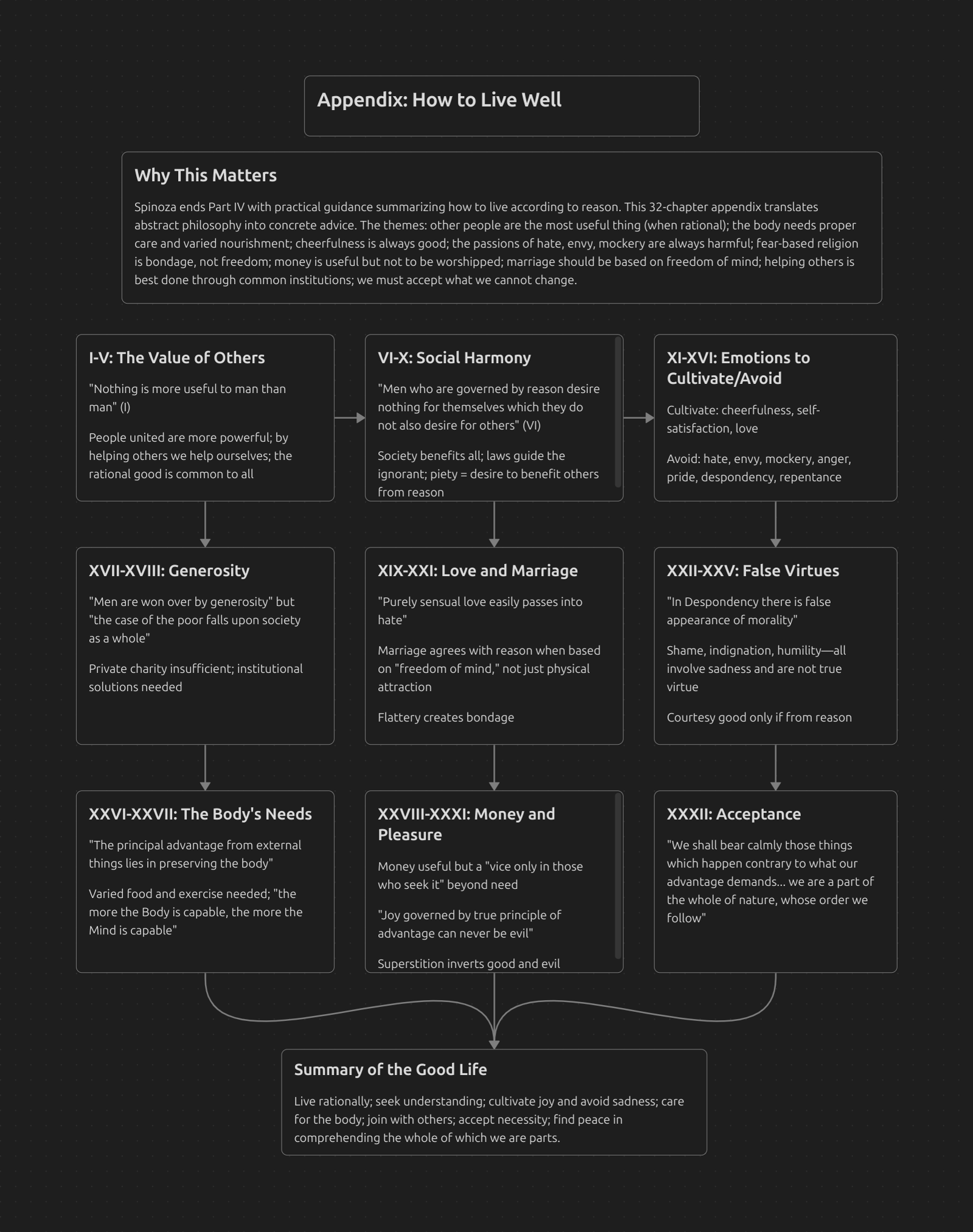 Spinoza ends Part IV with practical guidance summarizing how to live according to reason. This 32-chapter appendix translates abstract philosophy into concrete advice. The themes: other people are the most useful thing (when rational); the body needs proper care and varied nourishment; cheerfulness is always good; the passions of hate, envy, mockery are always harmful; fear-based religion is bondage, not freedom; money is useful but not to be worshipped; marriage should be based on freedom of mind; helping others is best done through common institutions; we must accept what we cannot change.